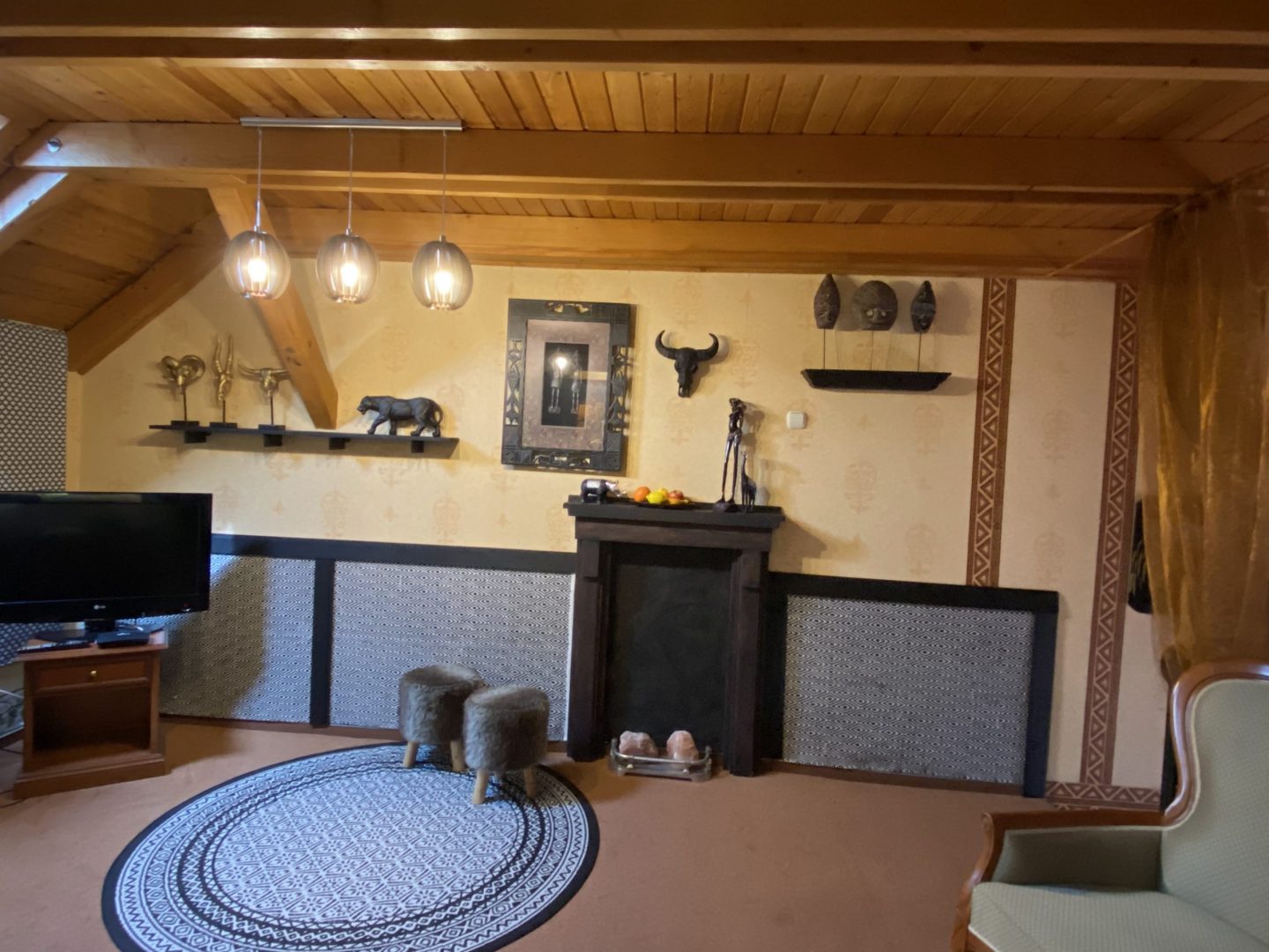 Ground floor: living room, bunk bed, sofa, LCD TV, bathroom with bathtub, separate WC